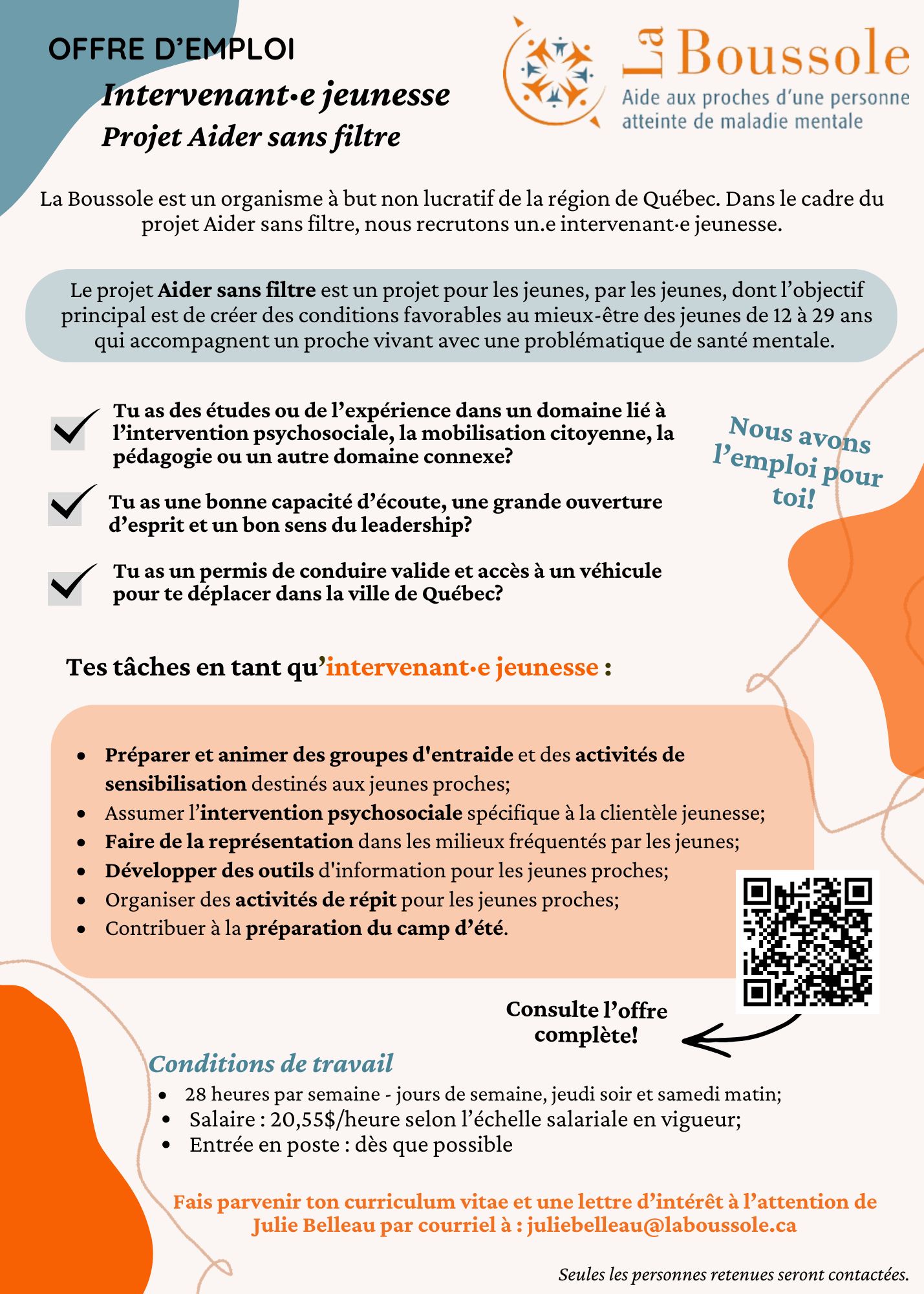 Pour postuler : les personnes intéressées sont invitées à faire parvenir leur curriculum vitae accompagné d’une lettre de présentation à l’attention de Julie Belleau par courriel à : juliebelleau@laboussole.ca.